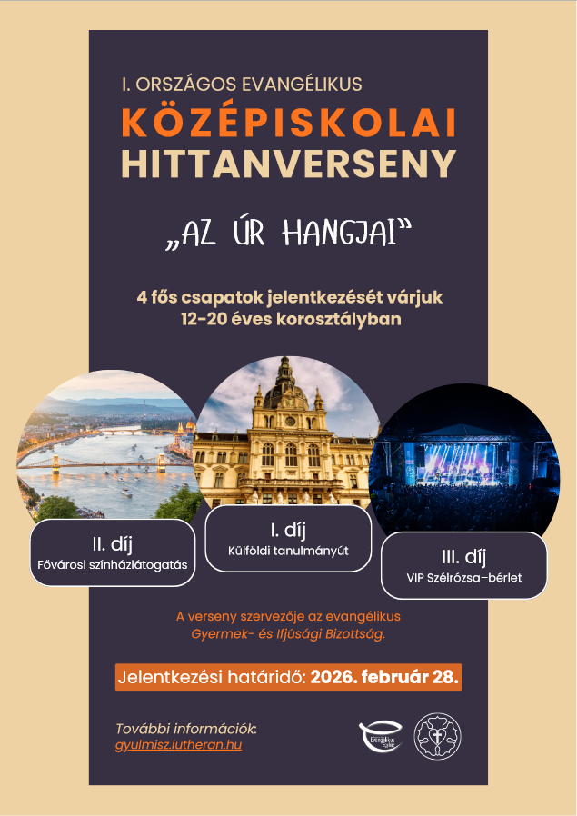 A Magyarországi Evangélikus Egyház Gyermek- és Ifjúsági Bizottsága középiskolai bibliaismereti versenyt hirdet egyházi iskolák és gyülekezetek 14–20 év közötti fiataljai részére. A versenyre négyfős csapatok jelentkezését várjuk, hogy összemérjék tudásukat és kreativitásukat a verseny fordulóiban.